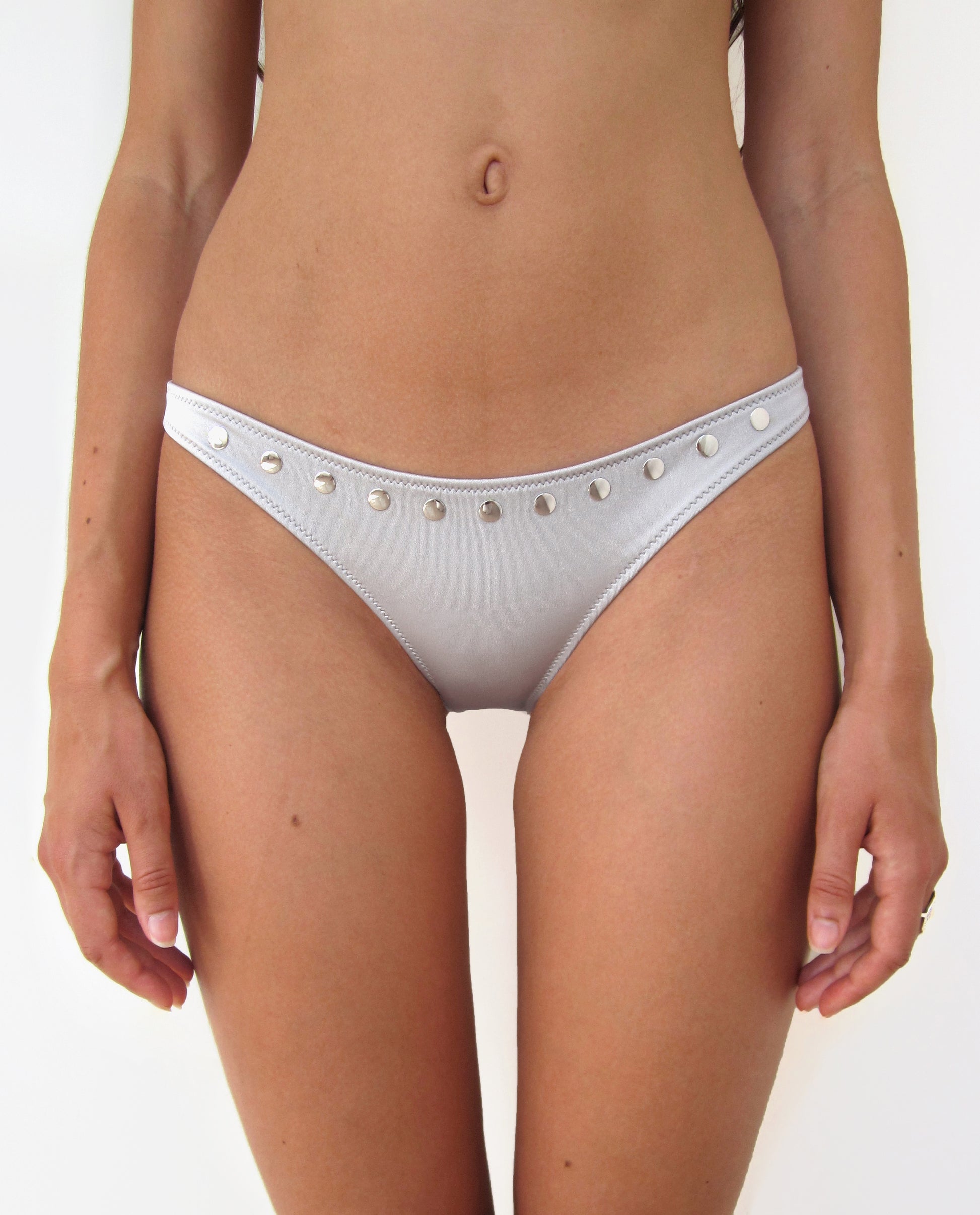 This bikini bottom is crafted in Barcelona using silky Italian Lycra and embellished with shiny silver studs. It’s double-lined for comfort and a clean, sculpted silhouette.