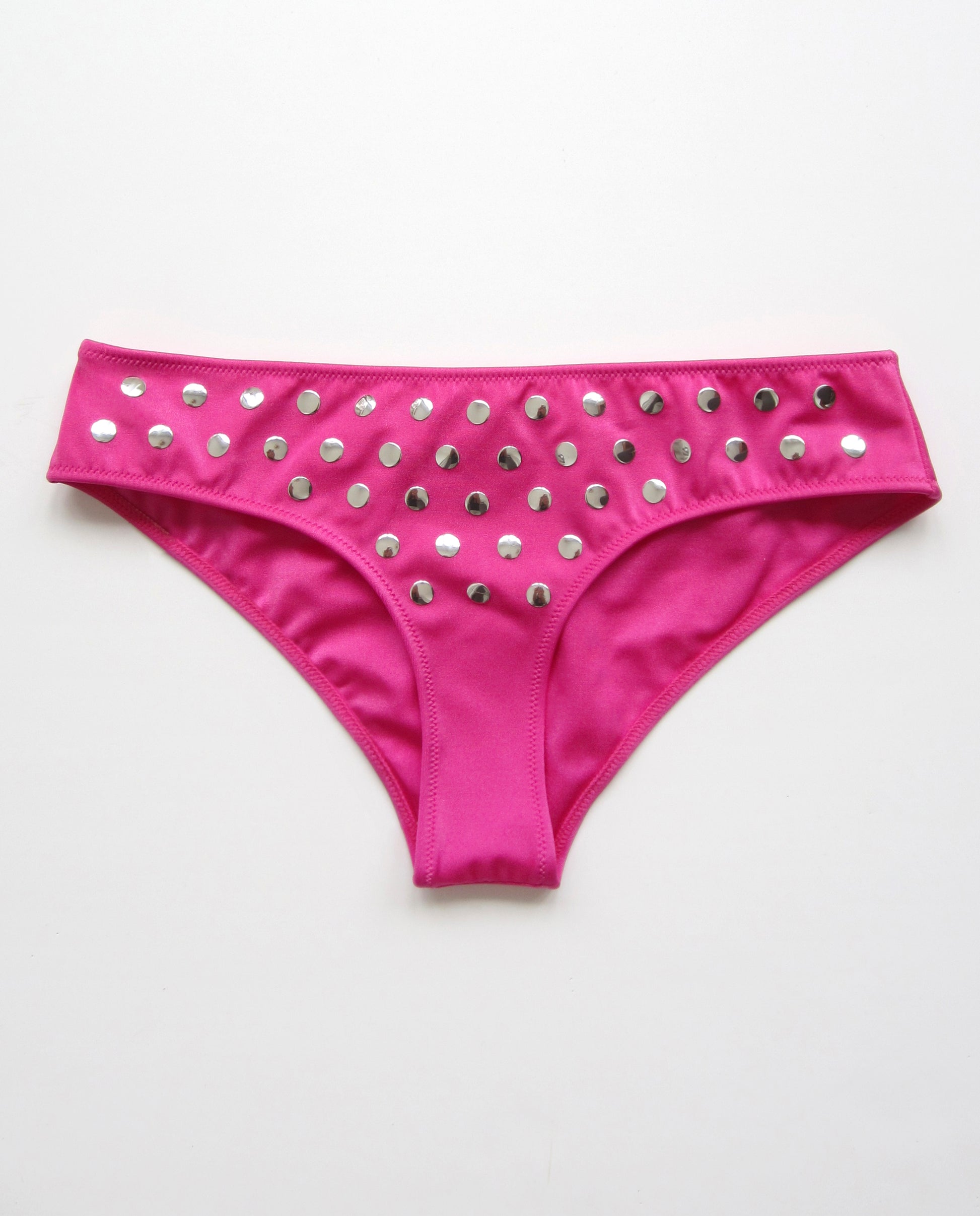 This bikini bottom is crafted in Barcelona using silky Italian Lycra and embellished with shiny silver studs. It’s double-lined for comfort and a clean, sculpted silhouette.